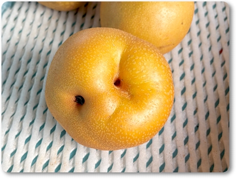 熟す前の梨の実にアラレがあたると・・・。 実が大きくなるとこうなります。 左の方はヘタの部分です。