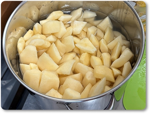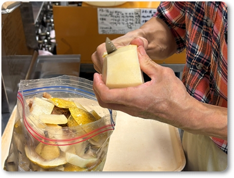 岩井店長がル・レクチエのコンポートを作っています。 完熟したル・レクチエの美味しい部分だけを切り取って、鍋に。 じっくり煮込みます。