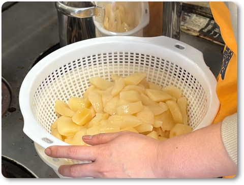 この度の居座り寒波は、かなり厳しいようです。 岩井店長の指導のもと、主任がル・レクチエのコンポートを作っています。