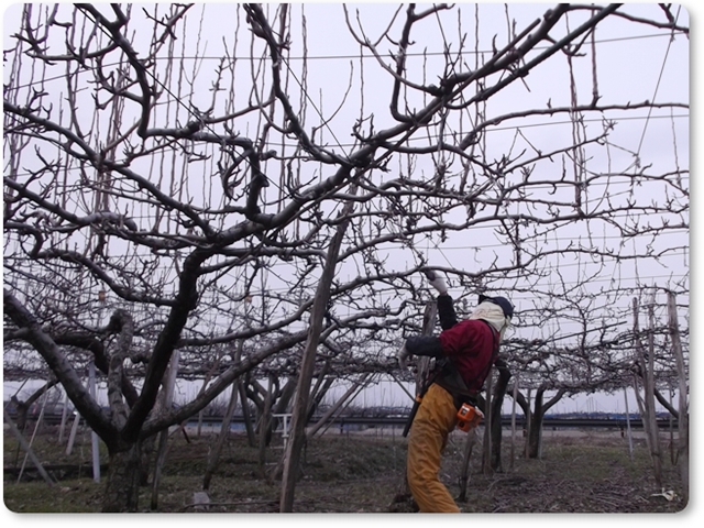 剪定している様子です。 下から残す枝を見極めています。 ちょっとつらい姿勢です。