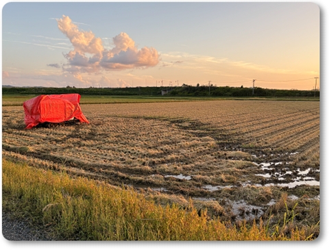 他より遅く、先月末から稲刈りをしています。 雨が降って稲が濡れるとコンバインに稲などが張り付いて作業ができなくなります。 今日はコンバインにシートをかぶせて終了。 夕焼けなので明日は天気が良さそう、稲刈りですね。