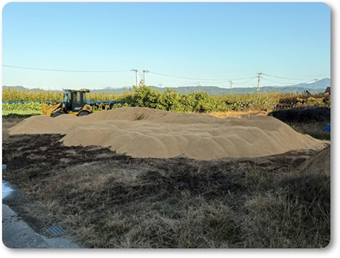 稲刈りが一段落すると、もみ殻も増えてきます。 岩井店長がもみ殻堆肥の山の裾野を広げて、より高く積めるようにします。
